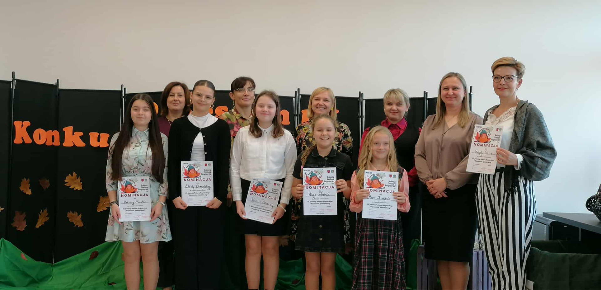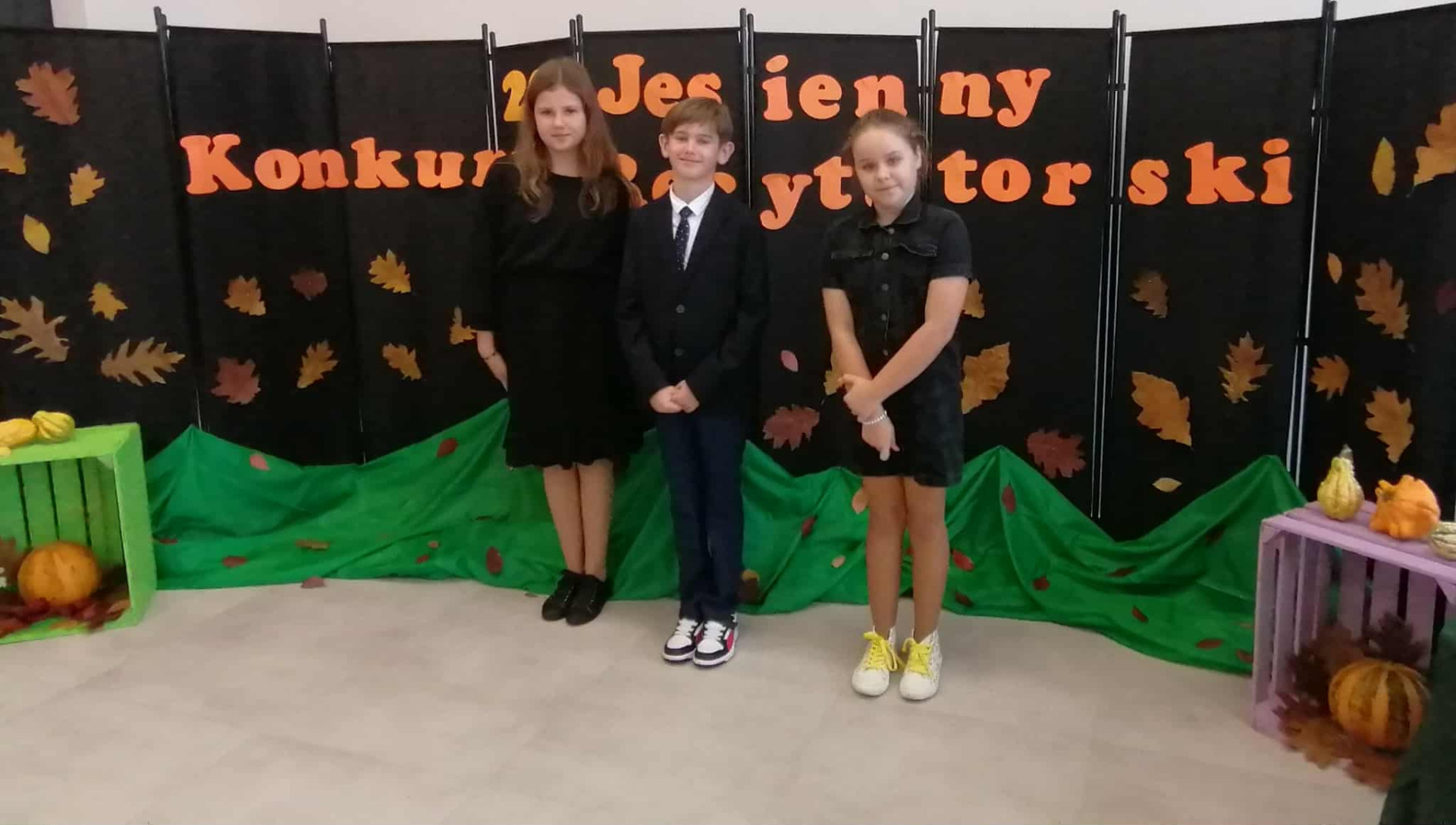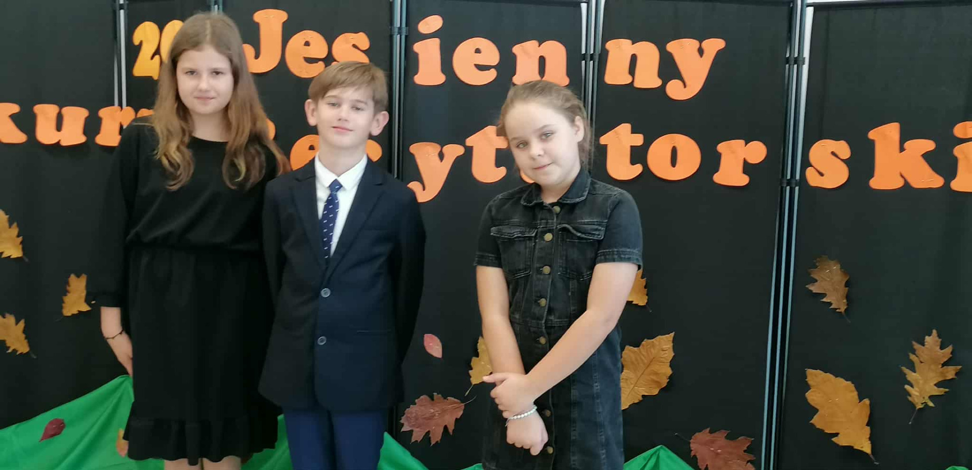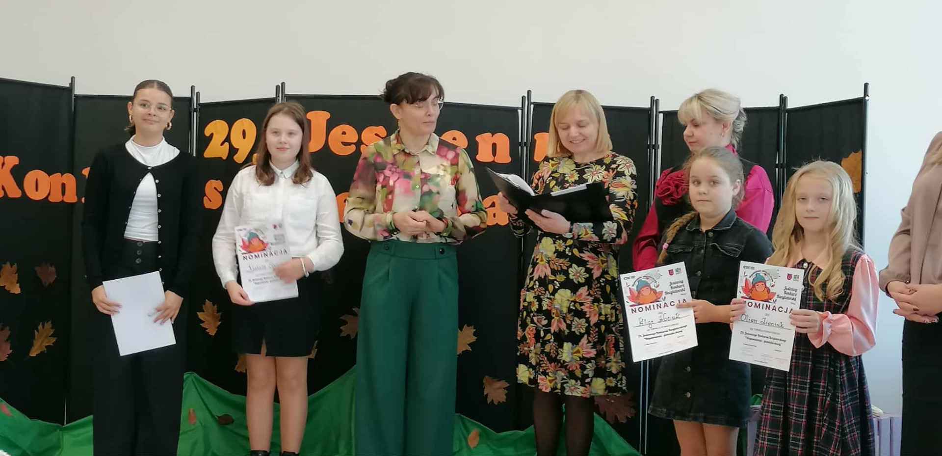 4 listopada 16 uczniów naszej szkoły wzięło udział w eliminacjach gminnych Jesiennego Konkursu Recytatorskiego. Tematem przewodnim konkursu były "Wspomnienia- pamiątki duszy". Nominacje do następnego etapu otrzymały: Oliwia Zieniuk kl. III, Alicja Kociuk klasa IV, Vanessa Świątek kl. VIII i Dorota Skrzyńska kl. VIII. Gratulujemy i życzymy sukcesów w następnym etapie.