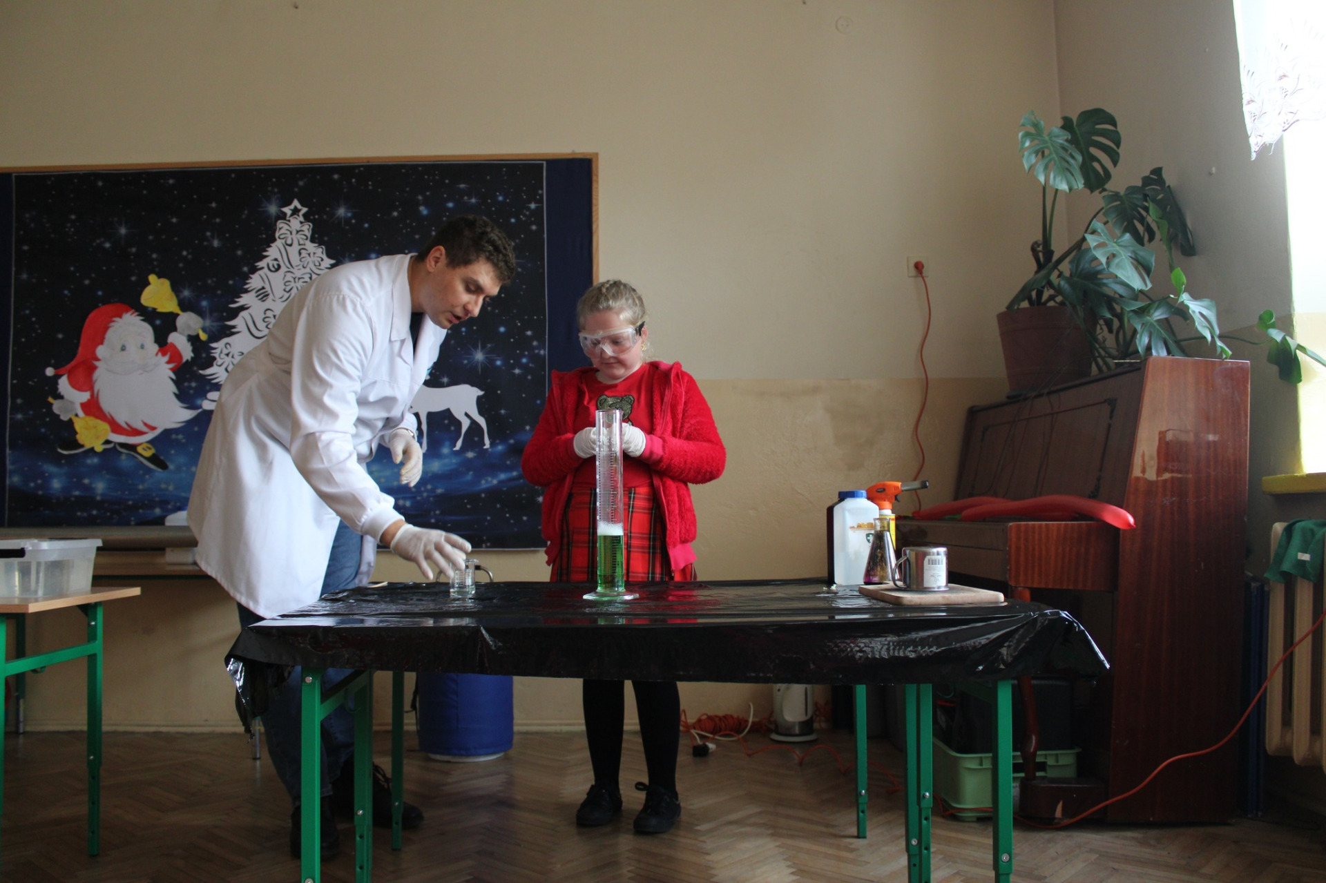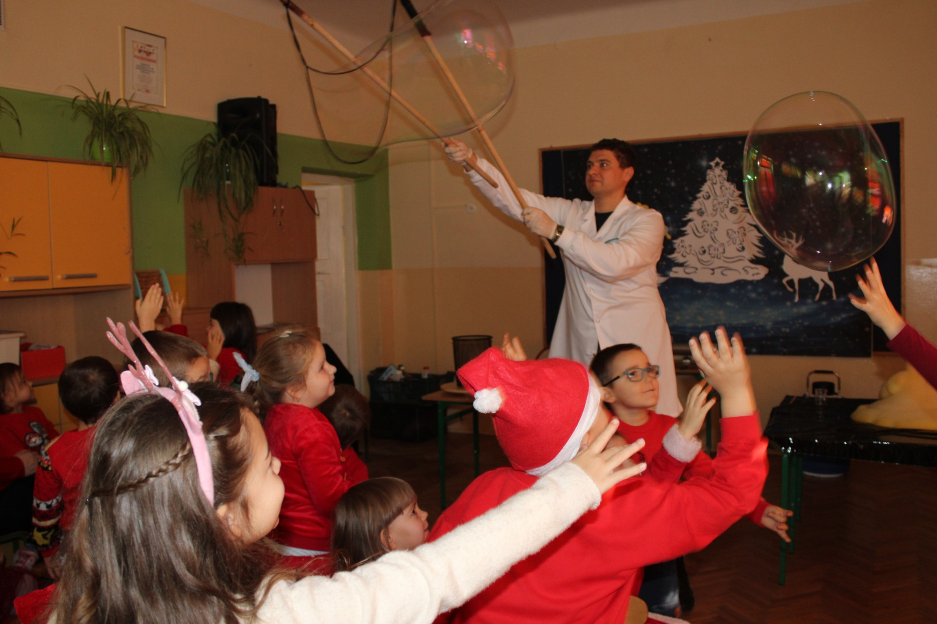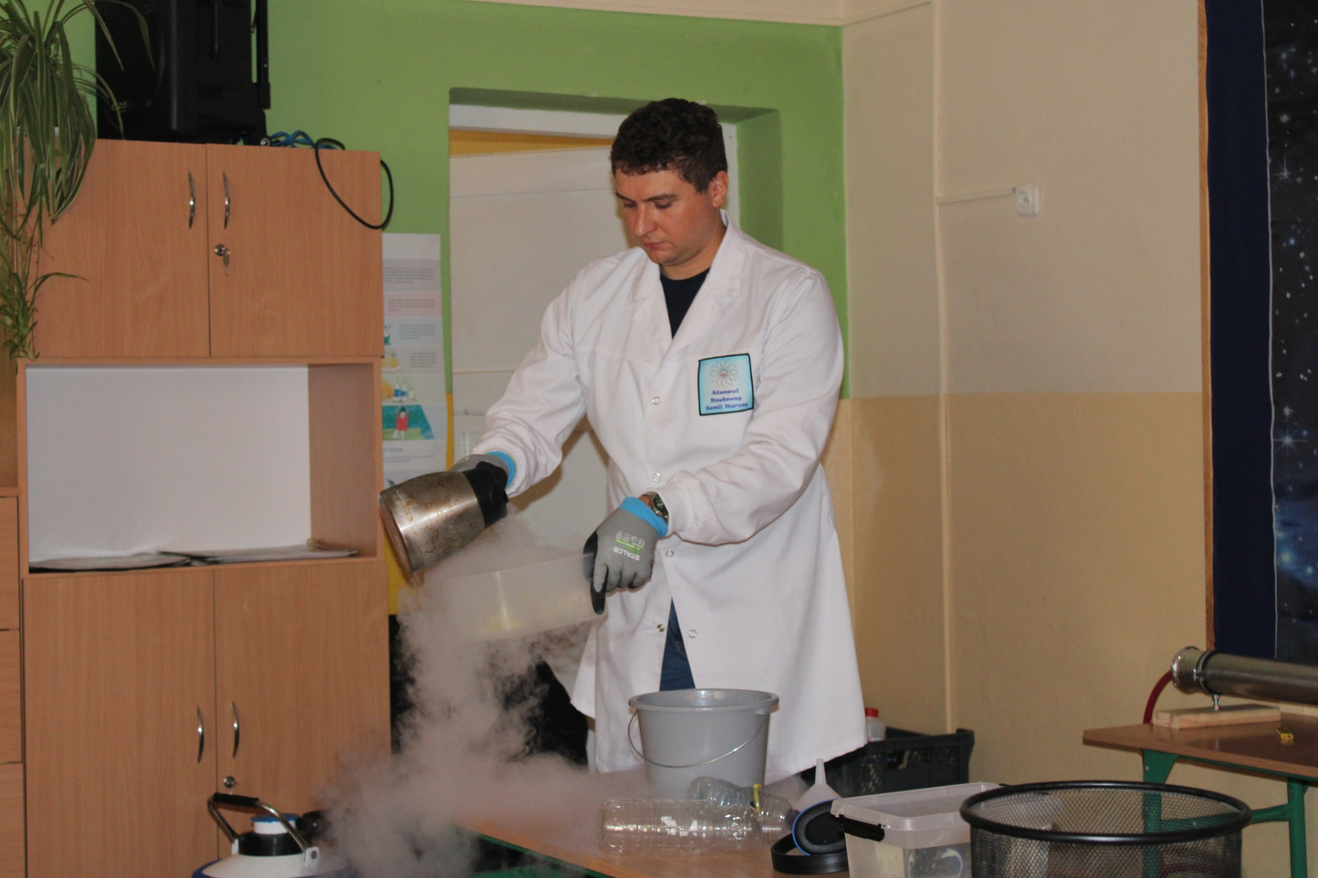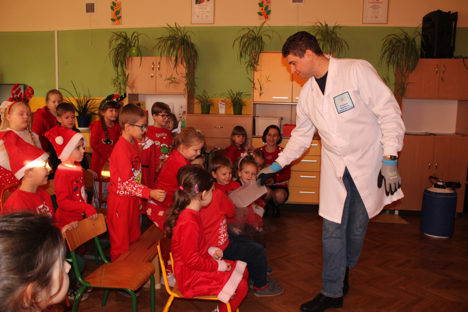 5 grudnia odwiedzili nas Atomowi Naukowcy, którzy przeprowadzili zajęcia przyrodnicze pt. Amplituda temperaturowa i o fizyce trzy słowa!!!. Dzieci miały okazję zobaczyć eksperymenty fizyczne i chemiczne min. z użyciem ciekłego azotu, nadmanganianu potasu, helu i gliceryny.