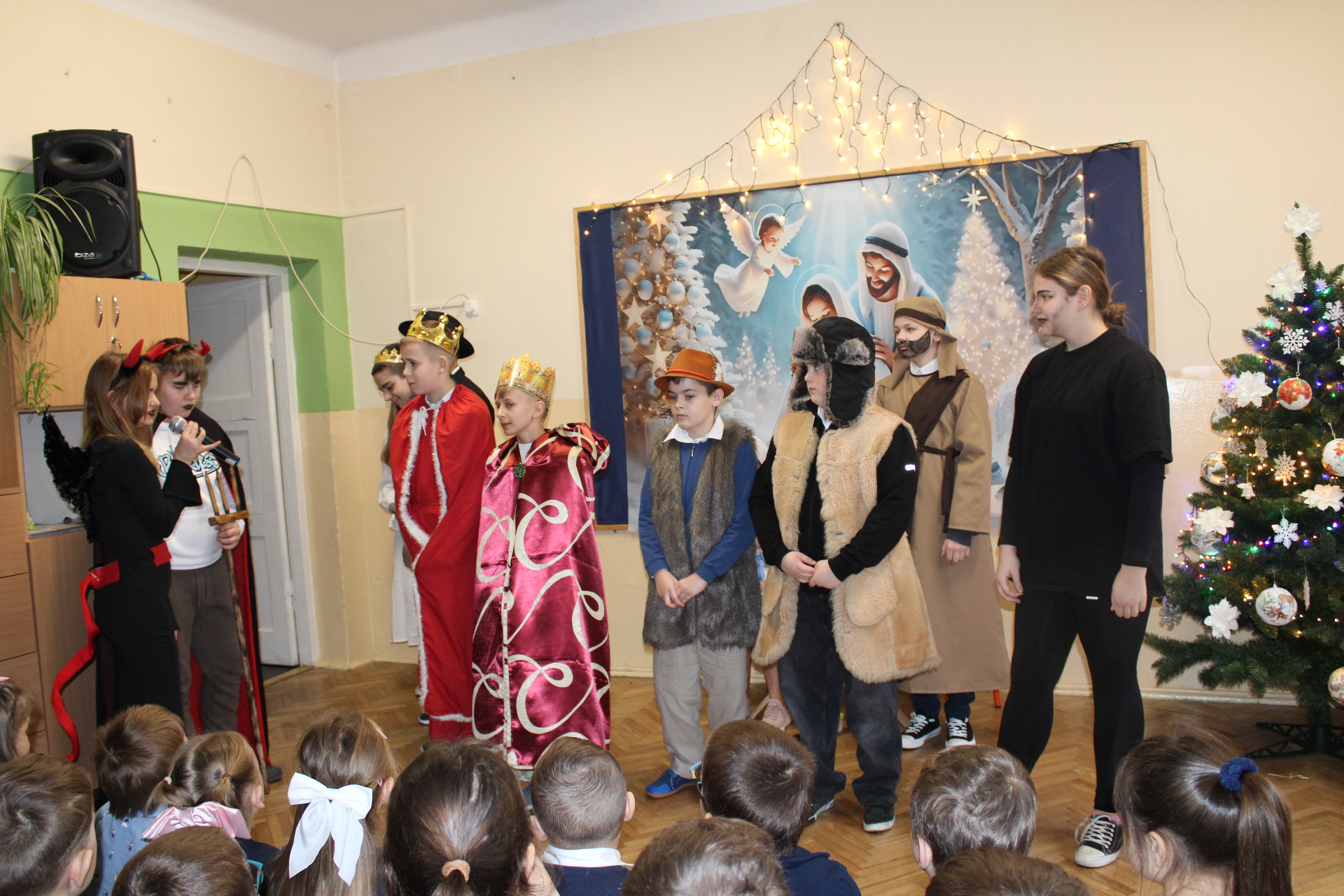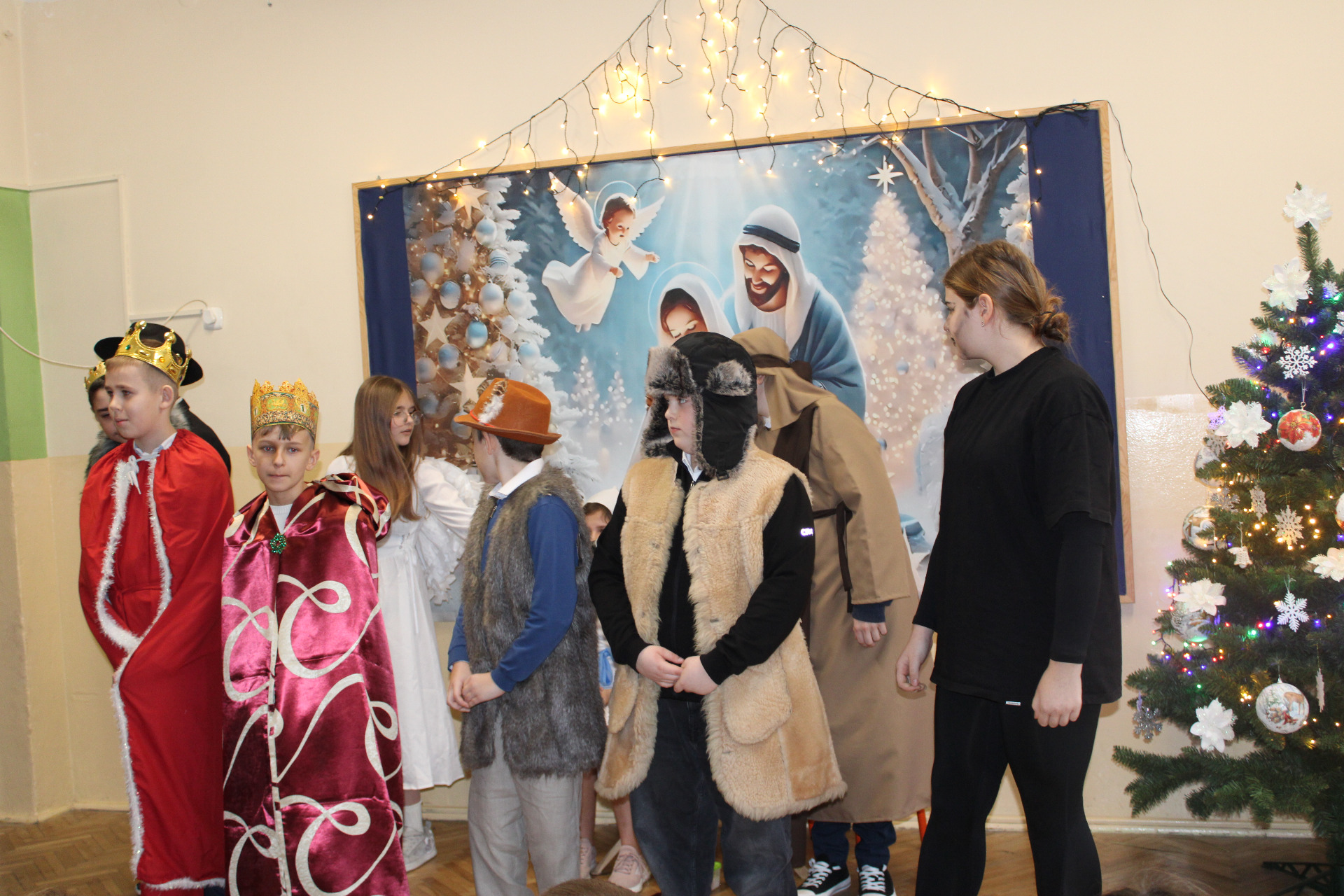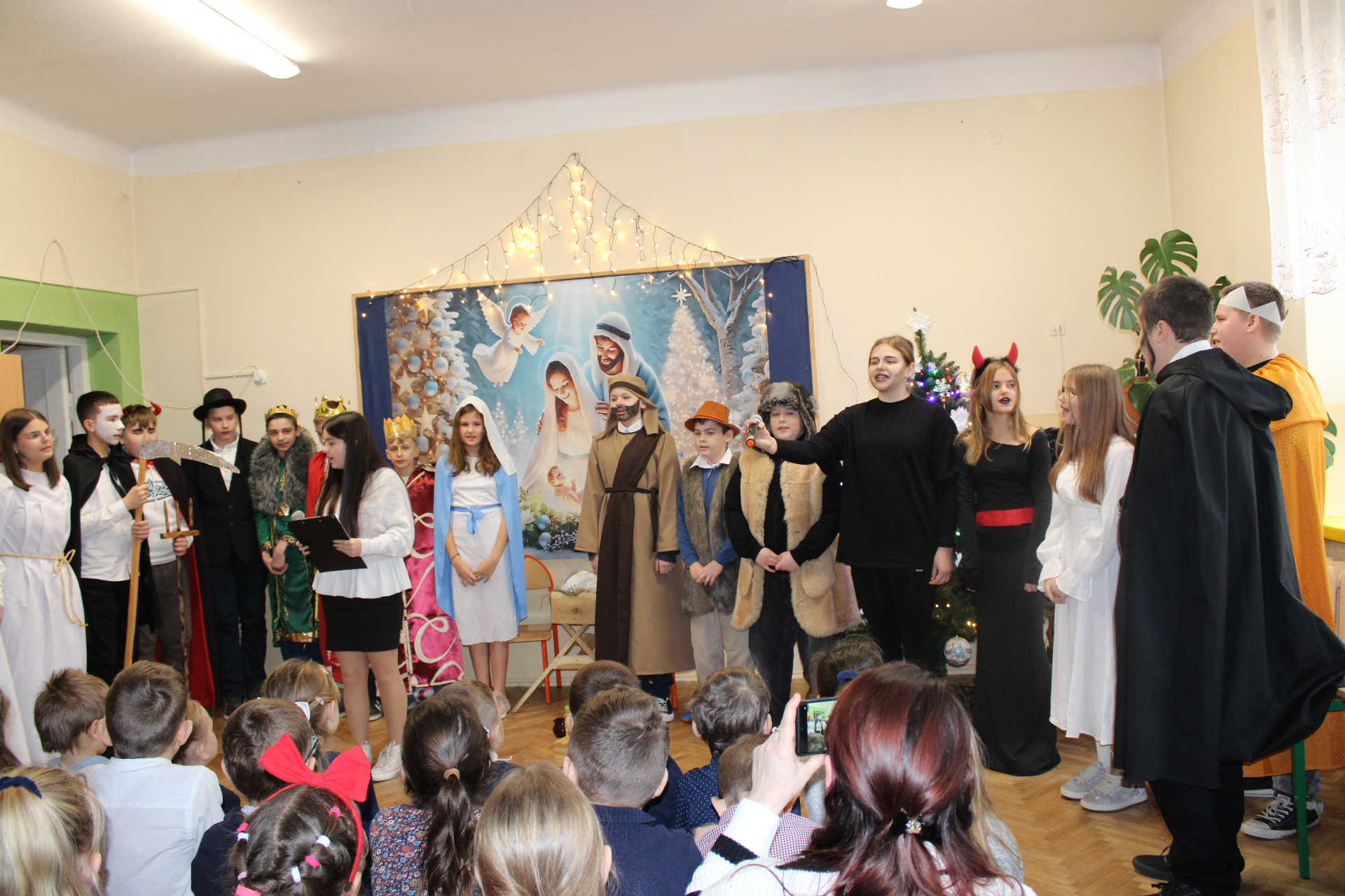 19 grudnia odbyła się szkolna wigilia. Głównym punktem programu były jasełka w wykonaniu uczniów klas IV–VIII, przygotowane pod kierunkiem pani Marty. Była to uwspółcześniona wersja historii narodzin Jezusa w Betlejem. Przedstawienie było pełne humoru, zwrotów akcji i niosło ważne przesłanie, że dobro zawsze zwycięża, a my powinniśmy postępować tak, aby trafić do nieba. Wielkie brawa należą się naszym aktorom, którzy zagrali brawurowo, a ich stroje pięknie dopełniły całość.
